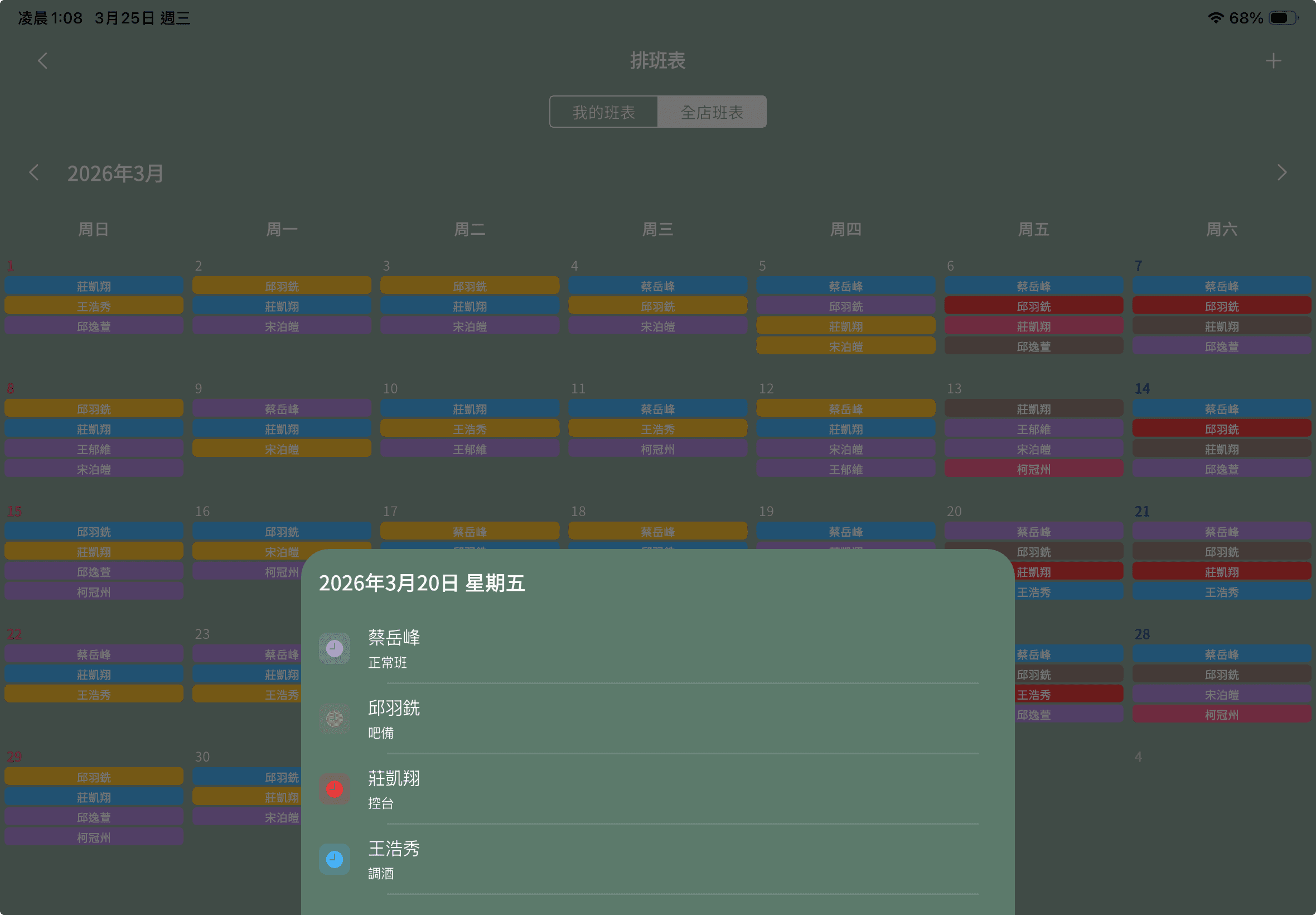 點餐、排班、庫存、薪資、營收分析,全部整合在同一套系統。員工只需學一個 App。